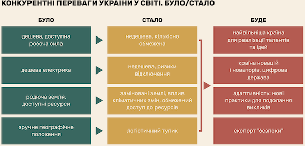 І насамкінець основне, те, з чого ми починали. Україна раніше мала чотири конкурентні переваги, які ми умовно продавали в світі. Це дешева робоча сила, дешева електрика, дешева земля і дешеві ресурси, логістичні можливості.