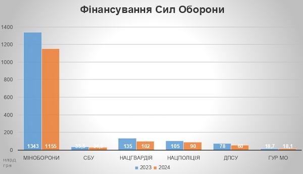 Так, на рівні поточного року у держбюджеті на 2024 рік передбачені видатки лише для Служби зовнішньої розвідки (5,96 млрд грн). В межах 2-3% зменшиться фінансування СБУ та ГУР Міноборони. Водночас для підрозділів МВС держбюджет передбачає зменшення видатків на 64 мільярди гривень, а для самого Міністерства оборони – на 188 мільярдів гривень.