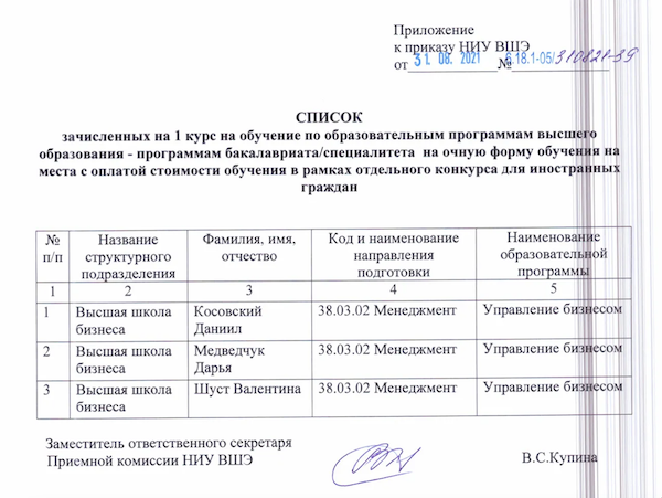 Наказ про зарахування Медведчук, Косовського та Шуст на сайті Вищої школи економіки