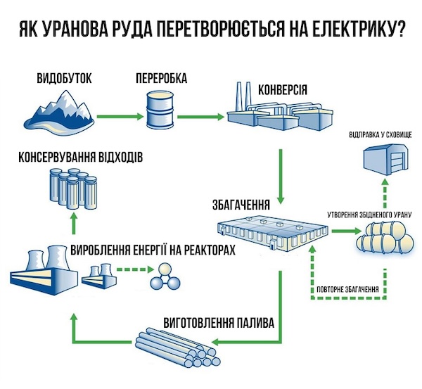 Для виробництва електрики з вугілля або газу потрібно купити сировину та з мінімальною обробкою доставити до місця спалювання. З ядерним паливом ситуація інша. Уранову руду спочатку добувають, обробляють кислотою, роблять конверсію, збагачують і лише потім створюють "капсули" з ядерним паливом.
