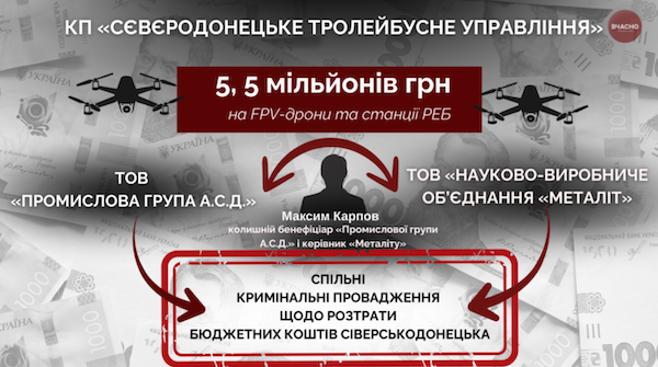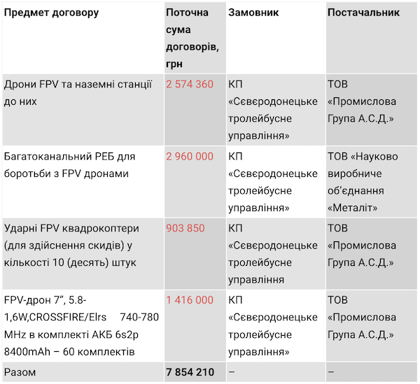 Гроші пройшли через КП «Сєвєродонецьке тролейбусне управління» по Програмі шефської допомоги військовим, яка дозволяє купувати оборонне обладнання без тендерів. Комунальники уклали дві угоди на постачання 150 FPV-дронів і три наземні станції управління (2,57 млн грн) та 20 станцій РЕБ (2,96 млн грн).