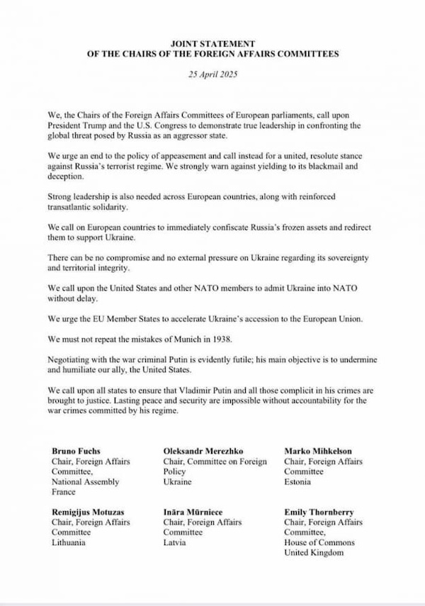 "Не може бути жодних компромісів та зовнішнього тиску на Україну щодо її суверенітету та територіальної цілісності", - підкреслюють автори. Вони також нагадали про історичні помилки 1938 року, натякаючи на марність будь-яких переговорів із Путіним.
