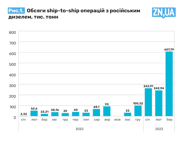 Величезні обсяги переливаються у морі на інші судна (операція ship-to-ship, STS). У березні та квітні майже 20% обсягів дизпалива, відвантаженого з Росії морем, змінювало судно під час слідування до порту призначення. Це дає змогу скоротити транспортні витрати на довгих маршрутах, а також використовувати STS для уникнення санкцій. Сервіси відстеження суден показують, що найбільші обсяги STS операцій здійснювалося біля берегів Греції, Гібралтару та Того. Після перевантаження танкери з російським продуктом далі прямували до портів Саудівської Аравії, ОАЕ, Туреччини та Бельгії. На думку трейдерів, в окремих випадках під час STS операцій російське дизпаливо може змішуватися з продуктом іншого походження та більше не вважатися російським згідно з європейським законодавством.