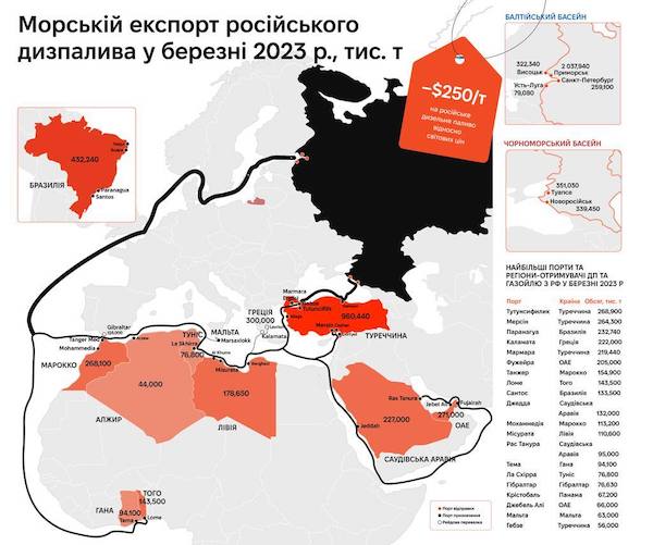 Якщо нафту можна продати тільки країнам, що мають нафтопереробку, то дизельне паливо — набагато ліквіднійший товар, який потрібен усім. Через припинення постачань суходолом до Європи у першому кварталі 2023 року експорт ДП із російських портів збільшився на 17% порівняно з аналогічним періодом минулого року. Зауважимо, що білоруське паливо теж не має іншого виходу, крім Росії та російських портів.