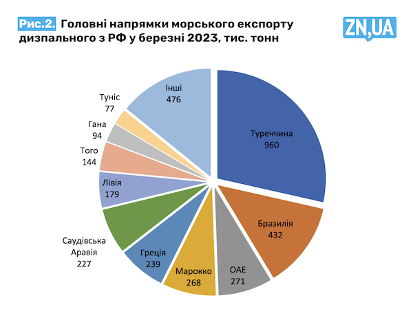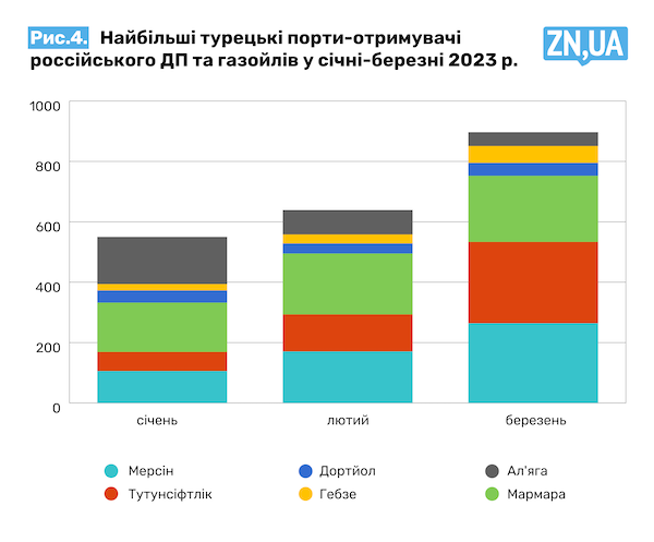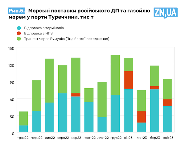 Акумулюючи величезні обсяги ДП з Росії та Індії, що практично повністю перейшла на російську нафту, Туреччина стала найбільшим хабом у Чорноморському та Середземноморському регіонах. Причому турецькі порти також здатні приймати величезні 100-тисячні танкери з Індії, чого не можуть робити румунські чи болгарські термінали. Згідно з даними Інституту статистики, за перший квартал 2023 року через турецькі термінали транзитом пройшло близько 550 тис. тонн дизпалива, більша частина якого — в Україну та Румунію, звідки, знову-таки, левова частка пішла в Україну (див. рис. 5).