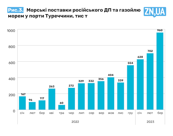Утім, найзручнішим притулком для російського палива стала Туреччина. Завдяки своєму географічному положенню, наявності розвиненої портової інфраструктури та величезному річному споживанню у 22–24 млн тонн, країна набула статусу ключового покупця «кривавого» дизпалива (див. рис. 3).