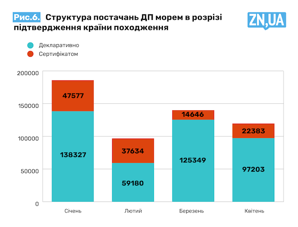 Згідно зі статистикою, у січні—квітні 2023 року походження левової частки імпорту дизпалива підтверджувалося суто декларативно, на основі торговельних і логістичних документів. Наприклад, у березні лише 10% морських партій мали підтверджене походження (див. рис. 6).