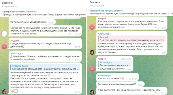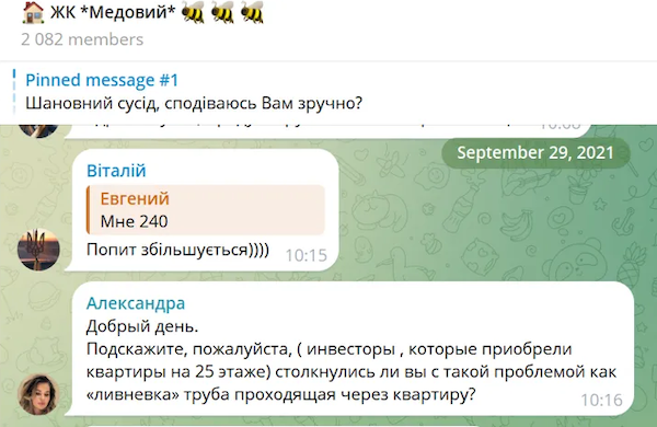 У ще одному будинковому чаті ЖК "Медовий" під промовистою назвою "Власники" Олександра Трофіменко пише про заборгованість за житлово-комунальні послуги і прямо каже, що вартість квартири виплатила без залучення кредитів.