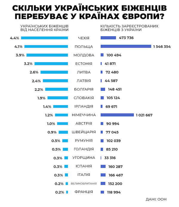 За даними Управління верховного комісара ООН у справах біженців (UNHCR), статус тимчасового захисту у країнах Європи до 3 січня 2023 року отримали близько 4,9 млн українських біженців. Це близько 1% від населення країн Євросоюзу. Найбільше українців прийняли Польща, Німеччина та Чехія.