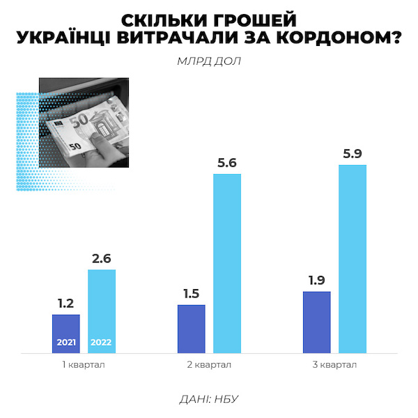 Обсяги витрат українців за кордоном у 2022 році зросли в рази порівняно з аналогічними витратами в довоєнний період. За даними НБУ, лише за перші пів року 2022 року витрати валюти з українських банків за статтею "подорожі" були на третину більшими, ніж за весь попередній рік.