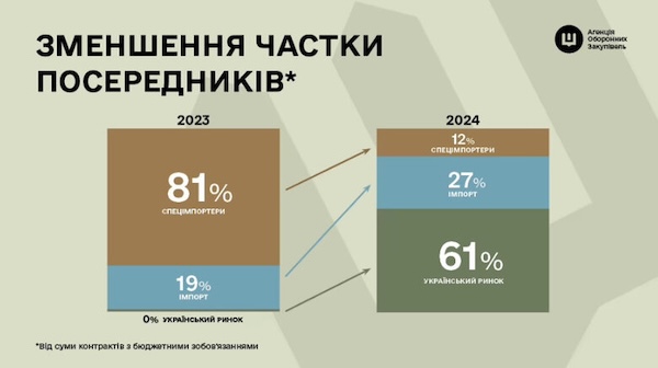 Ключовий фактор, що дозволив Агенції оборонних закупівель вирівняти та навіть знизити ціну на ринку озброєння та військової техніки (ОВТ) – це зменшення частки посередників. Якщо за перехідними контрактами Агенції, укладеними у 2023 році, частка спецімпортерів у сумі контрактів склала 82%, то в 2024 році – 12%.