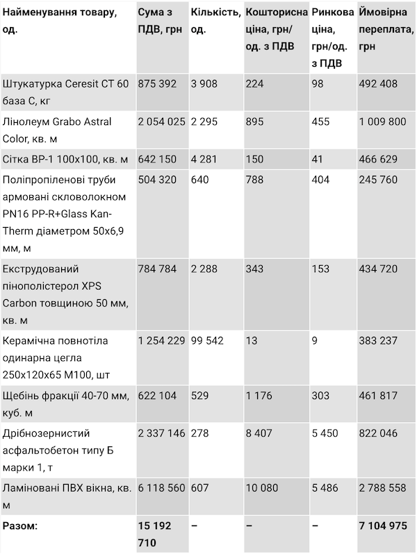 При цьому вартість низки найменувань будматеріалів у кошторисі значно завищена: