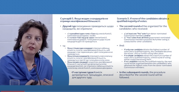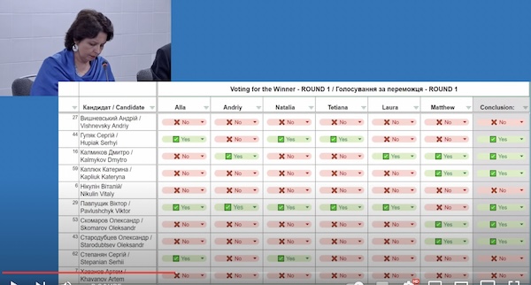 Для того, щоб кандидат переміг він мав набрати 3 голоси міжнародних членів комісії та один український.