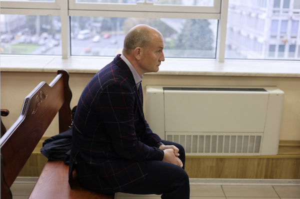 А також - таємничого чоловіка в стильному діловому костюмі - який перед засіданням перешіптувався із адвокатами, а згодом пошепки заборонив мені публікувати його фото із зали суду. І, звісно ж, не представився (на фото - сидить на лавці сам).