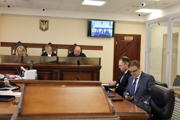 Через кілька днів після засідання на адресу редактора прийшло "звернення" від Антона Гончарука - адвоката Альони Шевцової та її адвокатів Андрія Давидченка (на фото справа в окулярах) та Артема Свитка (сидить справа від нього).