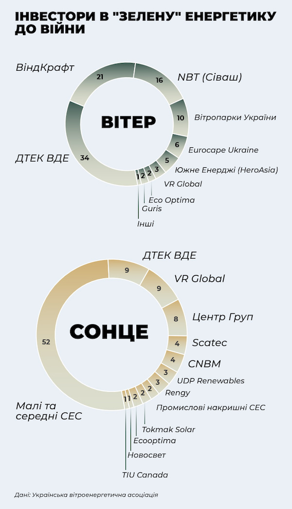 До 2022 року інвестиції в галузь перевищили 12 млрд дол, а ринок виробництва електроенергії з відновлюваних джерел в розрізі гравців виглядав так.