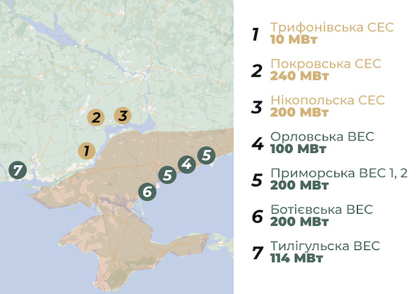 У січні 2023 року відновив роботу перший деокупований об’єкт – Трифонівська сонячна електростанція (СЕС, 10 МВт) компанії ДТЕК Рината Ахметова, а минулого тижня – перша черга Тилігульської вітряної електростанції (ВЕС, проєктна потужність 114 МВт) на Миколаївщині.