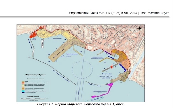 Схема порту Туапсе, мапа з доповіді Євразійського Союзу Вчених (ЄСУ). Червоним хрестиком відзначено місце удару