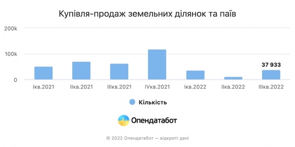 Проте ситуація з купівлею-продажем земельних ділянок та паїв краща: кількість угод за 2022 рік скоротилась лише удвічі.