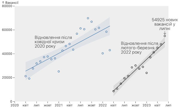 Проте з падінням економіки майже на 30%, яке приніс рік російського вторгнення, це важко порівняти. Попри це кількість нових вакансій, які пропонують роботодавці, уже вища, ніж у будь-якому місяці карантинного 2020 року.