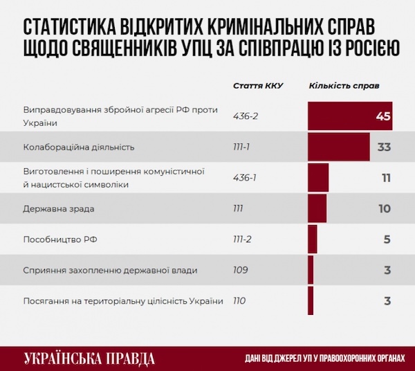 Провадження розпочали за різними статтями – від державної зради і виправдовування російської агресії проти України до розбещення неповнолітніх і незаконного переправлення громадян через кордон. Публікуємо статистику кримінальних справ, відкритих за статтями про співпрацю священиків із Росією.