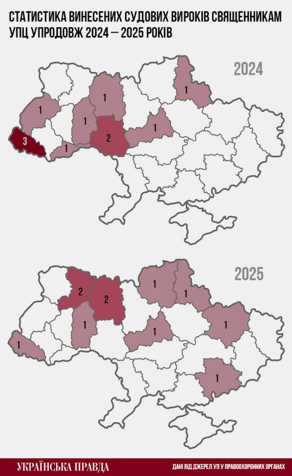 Наразі українські суди загалом визнали винними у вчинені злочинів 38 духівників Української Православної Церкви МП.