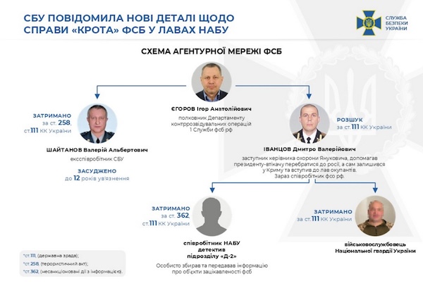 Згодом СБУ встановила, що ще один агент Єгорова-Іванцова - колишній співробітник МВС, який на час затримання виявився діючим співробітником НАБУ. За матеріалами справи, цей посадовець бюро був завербований ворогом ще у 2012 році.
