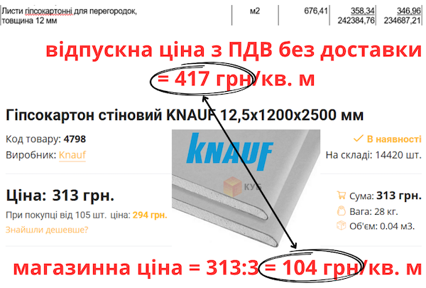 У інформації про ціни на матеріальні ресурси гіпсокартон для перегородок 12 мм замовили по 417 грн/кв. м. База «Куб» продає стіновий гіпсокартон Knauf 12,5 мм по 104 грн/кв. м, що вчетверо дешевше. Компанія «Перший дім» у Тернополі пропонує стіновий гіпсокартон VistaGips 12,5 мм по 115 грн/кв. м, що в 3,5 раза дешевше.