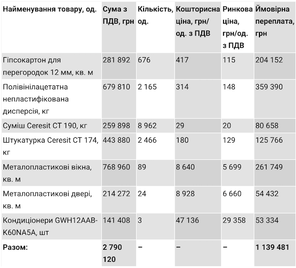 Ймовірна переплата тільки на зазначених позиціях щонайменше становить більше 1 млн грн.