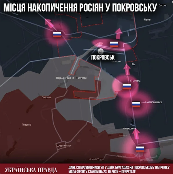 У Покровську Донецької області перебуває щонайменше 250 російських окупантів, які вступають у стрілецькі бої та розстрілюють українських військових на позиціях, зокрема операторів БПЛА. Логістика до міста під повним контролем російських дронів.