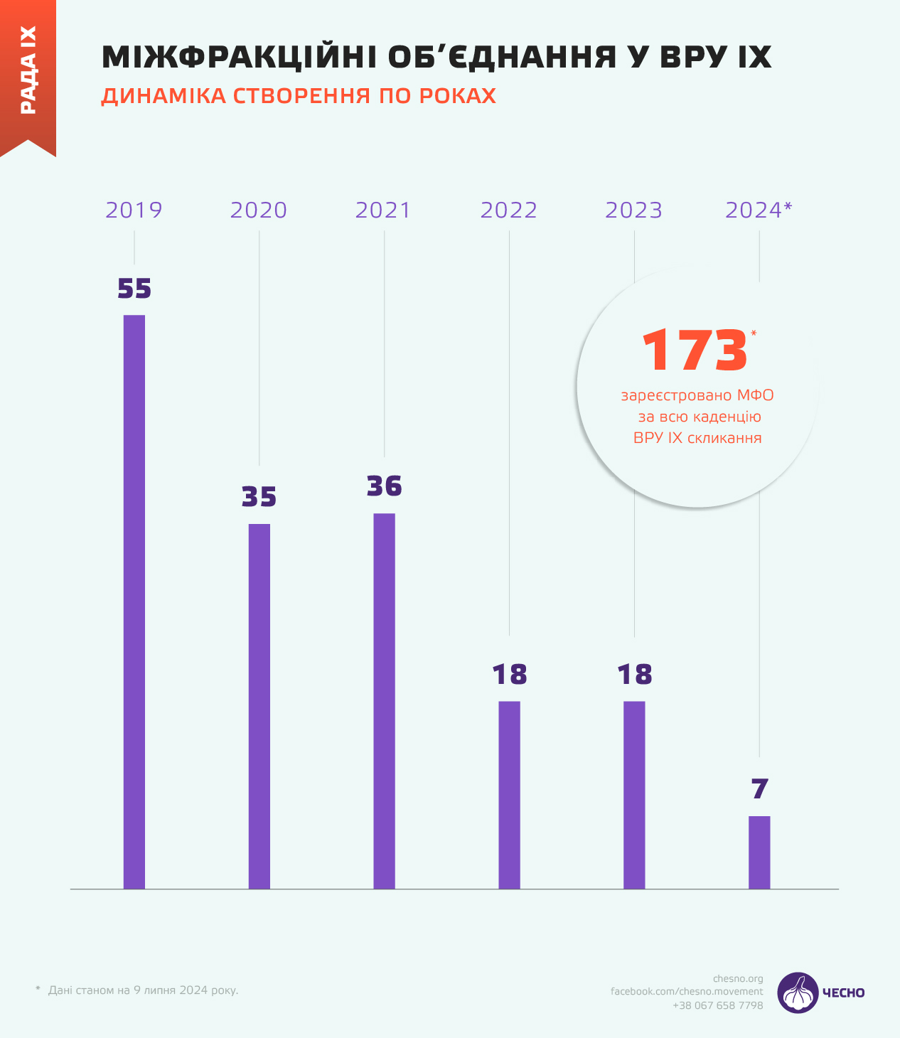 Загалом у Верховній Раді ІХ скликання створили 173 міжфракційні депутатські об’єднання, найбільше — у перший рік каденції. Найпопулярнішими серед депутатів залишаються гуманітарні та географічні об’єднання, кількість яких росте з кожним роком.