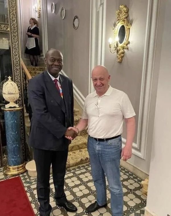 27 липня, в день відкриття саміту, пан Ситий опублікував фотографію свого шефа Пригожина, на якій той (у петербурзькому готелі Trezzini, що належить йому, — де, до речі, в день «путчу» слідчі, як підтвердив і сам Пригожин, виявили «газель» і два автобусики» з грошима, які призначалися на виплату «зарплат» його бойовикам та «компенсацій за вантаж 200») тисне руку Фредді Мапуке, начальнику протоколу президента Центральноафриканської Республіки.