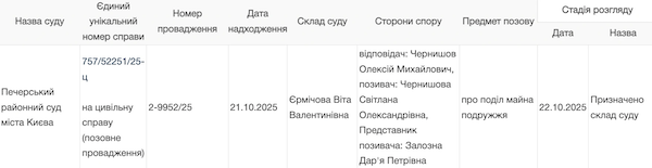 Зазначається, що позов вона подала до Печерського районного суду міста Києва. Відповідач – Олексій Чернишов. По справі призначено склад суду.