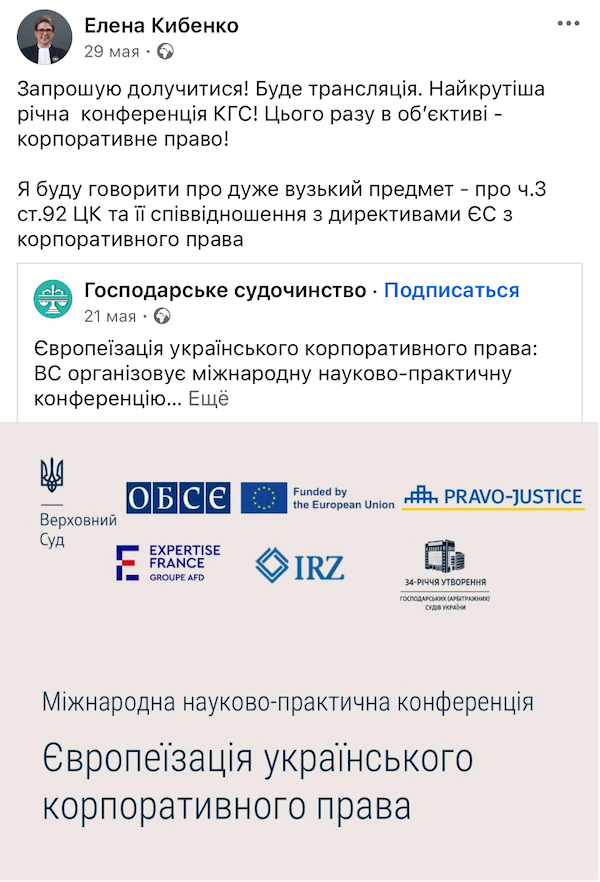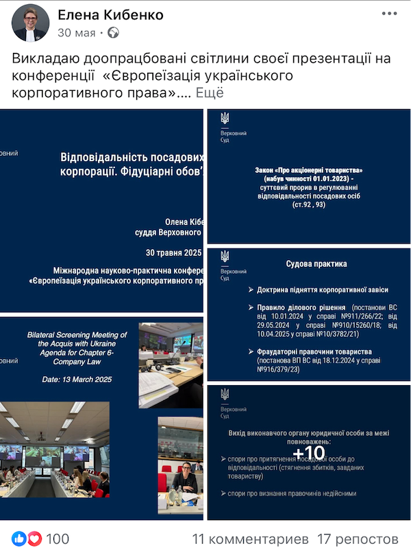 Проаналізувавши соціальні мережі судді, можна побачити, що вона затятий учасник професійних конференцій на тему правосуддя як в Україні, так і за кордоном. З квітня по жовтень 2025 р. вона відвідала більше 10 заходів, на яких була тематичним спікером та доповідачем. Так чому саме віддає перевагу Кібенко, особистісному професійному піару та підвищенню впізнаваності у медіа, підіграванню інтересам державних зрадників чи сумлінному виконанню обовʼязків у Верховному суді й здійсненню правосуддя на практиці?