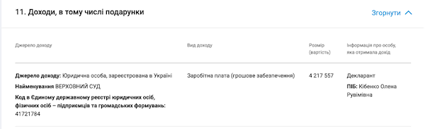 Варто зазначити, що в річній декларації за 2024 р. Кібенко декларує за основним місцем роботи тобто у Верховному суді 4 млн 217 тис грн заробітньої плати. Інакше кажучи, платники податків нашої держави утримують за 351 тис грн таку суддю, як Кібенко Олену Рувімівну, яка відпрацювує замовлення Тарпана, який підозрюється у пособництві росії. В той час як населення по гривні збирає на потреби Збройних сил України, аби вистояти в кровопролитній війні з рф.