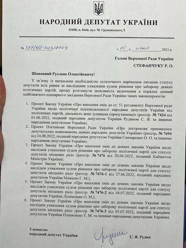 "Інформую щодо збору підписів за позбавлення депутатів від заборонених партій, і в тому числі ОПЗЖ, мандатів - маємо 150 підписів!Особливо вдячний моїм колегам, що перебувають на передовій і боронять Україну, але знайшли час та можливість підписати лист. Сергій Рудик, дякую, твій підпис став 150. Роман Лозинський, Роман Костенко, Андрій Шараськін - вони кожного дня бачать той жах, який принесли представники ОПЗЖ на нашу землю. Вони не сумніваючись поставили свої підписи, компромісів щодо представників кремля бути не може", - зазначає нардеп.