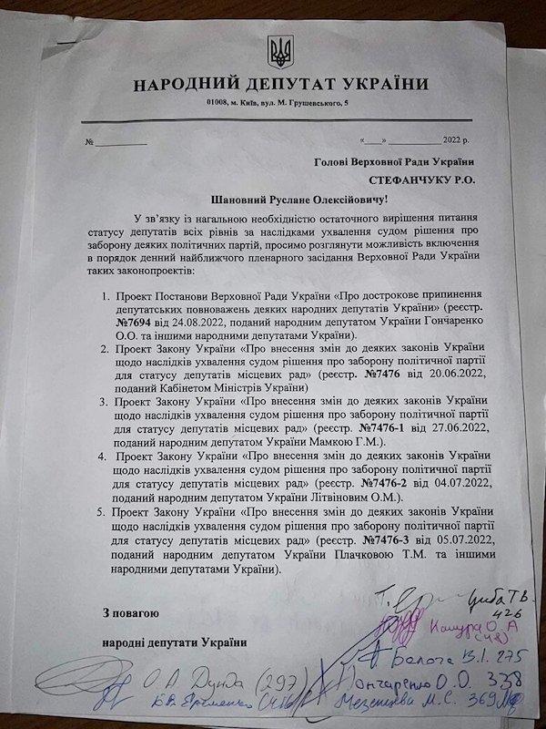 "Збір підписів завершується, далі слово за спікером Русланом Стефанчуком. Ми не можемо і далі ігнорувати представників ОПЗЖ в парламенті і в радах усіх рівнів", - додає Дунда.