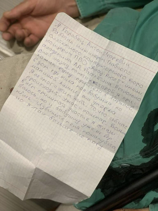 У передсмертній записці він написав, що це була ракета, до якої він "приклав руку". А в тому будинку мешкала його бабуся. Вона загинула.