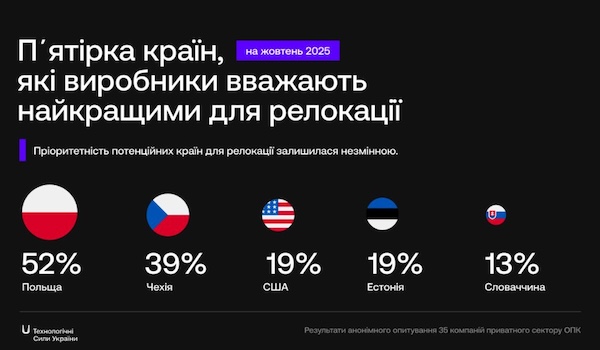 П’ятірка найпопулярніших країн для релокації залишається незмінною: Польща, Чехія, США, Словаччина та Естонія.