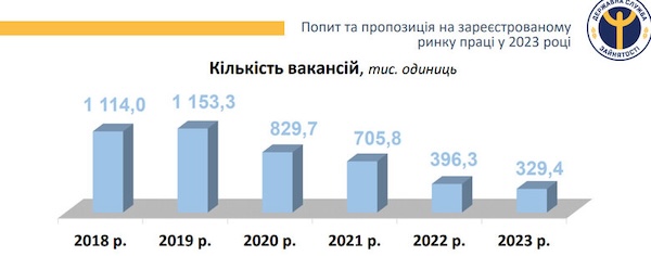 Впродовж 2023 року до Державної служби зайнятості роботодавці спрямували 329 тис вакансій, найбільше – 18% - стосувалося роботи у переробній (здебільшого харчовій) промисловості, 16% - у оптовій та роздрібній торгівлі.