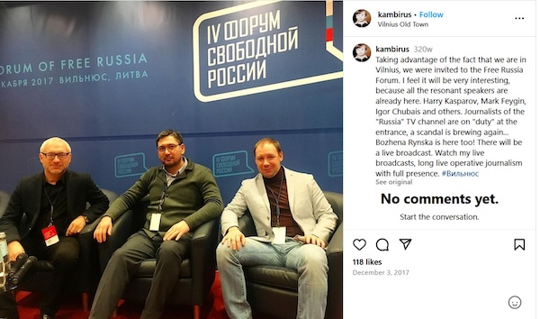Цікаво, що на свій перший захід у Вільнюс Жихарєв приїхав машиною разом із двома іншими учасниками і з ними повернувся назад. Це Руслан Камбієв та Расул Катаганов, правозахисники з Північного Кавказу. The Insider звернувся до Руслана Камбієва, щоб поцікавитись обставинами їхньої спільної поїздки. Камбієв спочатку сказав, що взагалі не пам'ятає людину на ім'я Іван Жихарєв, а коли їй представили фотографію всіх трьох у пості в Instagram, відповів, що познайомився з нею на Вільнюському форумі, куди сам прилетів літаком. Коли The Insider звернув його увагу, що прикордонні записи показують, що на форум він прибув на машині і в цій же машині був «Жихарєв», Камбієв згадав, що вони дійсно приїхали на машині, а познайомилися на попередньому форумі. Коли The Insider нагадав, що цей форум був першим, у якому вони брали участь, Камбієв відповів, що тоді вони, швидше за все, познайомилися на врученні премії «Герой Кавказу» у центрі Сахару. The Insider звернув увагу Камбієва на те, що вручення премії було на кілька місяців пізніше за форум. Тоді Камбієв узяв паузу і наступного дня згадав: вони познайомилися на заході МОШПЛ 14 жовтня 2017 року, у Сахарівському центрі.