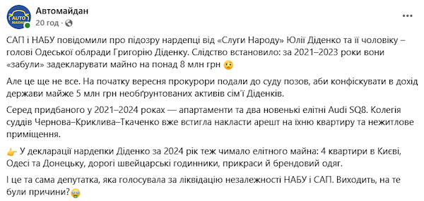 "Але це ще не все. На початку вересня прокурори подали до суду позов, аби конфіскувати в дохід держави майже 5 млн грн необґрунтованих активів сім’ї Діденків. Серед придбаного у 2021–2024 роках — апартаменти та два новенькі елітні Audi SQ8. Колегія суддів Чернова–Криклива–Ткаченко вже встигла накласти арешт на їхню квартиру та нежитлове приміщення.