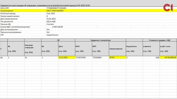 Журналісти "Слідства.Інфо" отримали документи від джерела у російській податковій, у яких ідеться про те, що 27 грудня 2021 року ВГТРК перерахувала 99 599 000 рублів ООО "Грин Филмс".