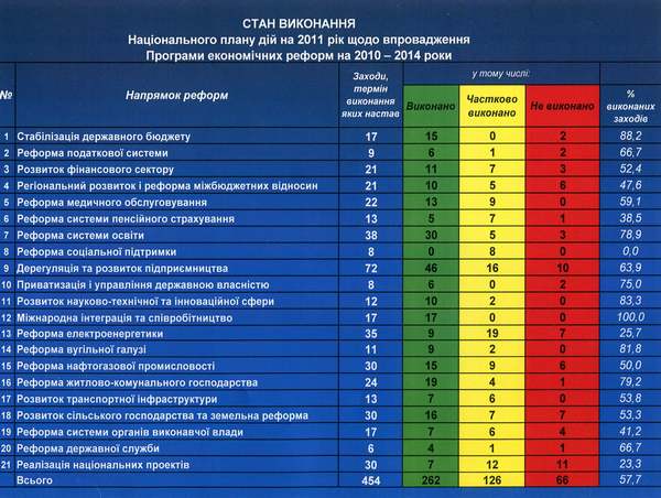 Общее состояние выполнения Национального плана выглядит таким образом: выполнено — 57% (262 мероприятия), частично выполнено — 28% (126 мероприятий), не выполнено — 15% (66 мероприятий). По информации ZN.UA, 92 из 262 мероприятий были выполнены в течение последних двух недель – после того, как на очередном заседании комитета по реформам глава администрации президента Сергей Левочкин раскритиковал собравшихся за то, что исполнительной властью выполняется не более 30% распоряжений Виктора Януковича и реализовывается примерно такая же часть инициатив.