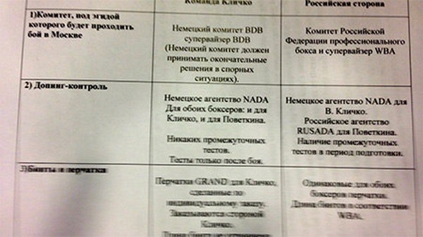 Список основных разногласий между командами олимпийских чемпионов по боксу — чемпиона WBA в супертяжелом весе россиянина Александра Поветкина и абсолютного чемпиона мира украинца Владимир Кличко появился в Сети.
