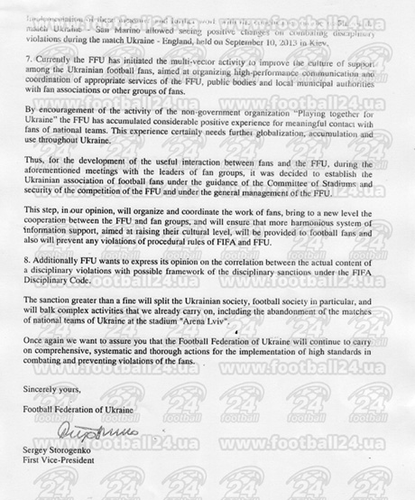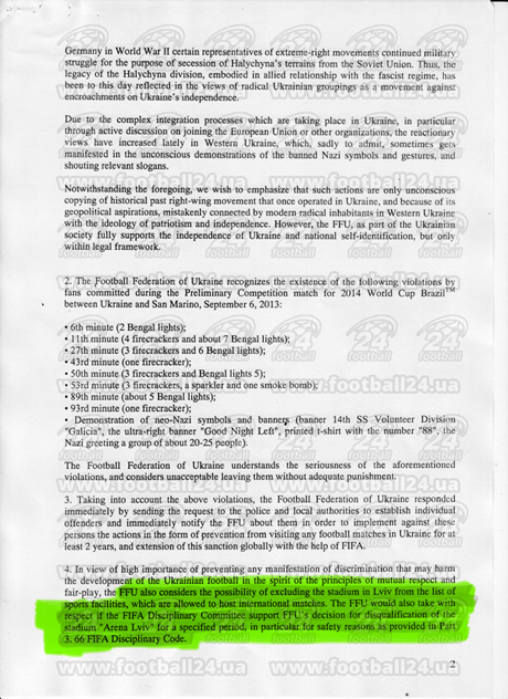 ФФУ также надеется, что Дисциплинарный Комитет ФИФА поддержит ее решение о дисквалификации стадиона „Арена Львов“ на установленный период, в частности в целях безопасности, о чем говорится в части 3. 66 Дисциплинарного Кодекса ФИФА», — идет речь в одном из фрагментов письма.