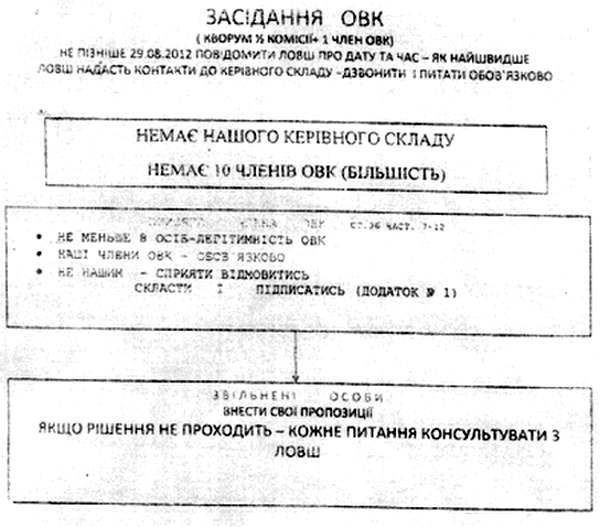 «Штаб рекомендует во время проведения заседаний „не нашим“ членам ОИК способствовать отказаться от принятия присяги. Есть серьезные предложения о назначении технических работников — персонально по фамилиям. Штаб Партии регионов рекомендует давать предложения всех „наших“. Если председатель ОИК не является представителем правящей партии, то те люди, которые предлагаются на технических работников, должны быть „зарезаны“ во время процесса голосования», — уточнила политик.