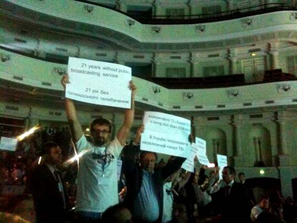 Как пишет Телекритика, во время выступления Януковича на форуме, журналисты подняли плакаты о цензуре в Украине и отсутствии демократии. Охрана Януковича выдергивала плакаты у журналистов.