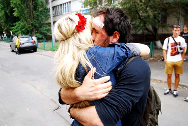 Как пишет в Фейсбук адвокат потерпевших Ярослав Яценко, на активисток FEMEN и Дмитрия, которые были одеты и не проводили никакой акции, 27 -го в 16.10 по киевскому времени во дворе дома на Оболони напали около 10 неизвестных человек в штатском и сильно всех избили, Дмитрию разбили голову, после чего всех передали сотрудникам милиции.