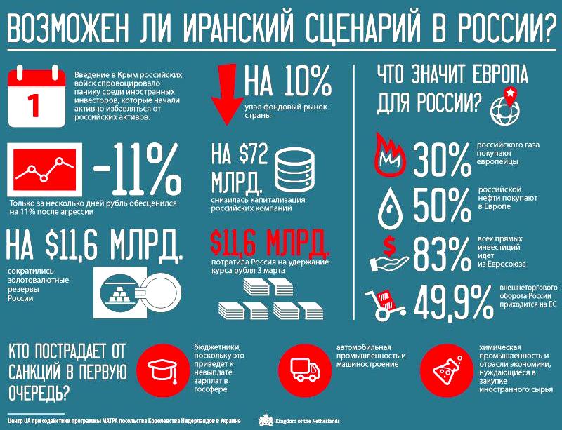 Похожая ситуация складывается в России. После вооруженного вторжения в Крым 3 марта этого года, состоялось значительное падение курса рубля, и Центробанку пришлось потратить 11,6 млрд. долл. на его удержание. Введение санкций Соединенными Штатами будут иметь больше политические и военно-политические последствия для России, поскольку США охватывают незначительный процент в структуре внешнеторгового оборота и внешних инвестиций России.